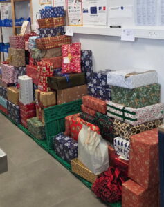 Mardi 23 décembre, lors de la distribution alimentaire au centre des Restos du Coeur de DOLUS, le Père Noël est passé pour distribuer avec les bénévoles les boites cadeaux de Noël « femme », « homme » et « enfant » collectées par les mairies de Saint Pierre d’Oléron et de Dolus ainsi que par le magasin SUPER U de Saint Pierre, pour les offrir aux Personnes accueillies des Restos du Cœur.